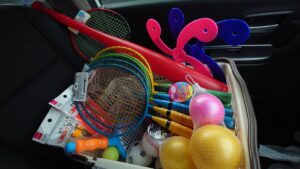 遊具を置き、子どもたちが集まり、一緒に遊び、ご飯を食べる。